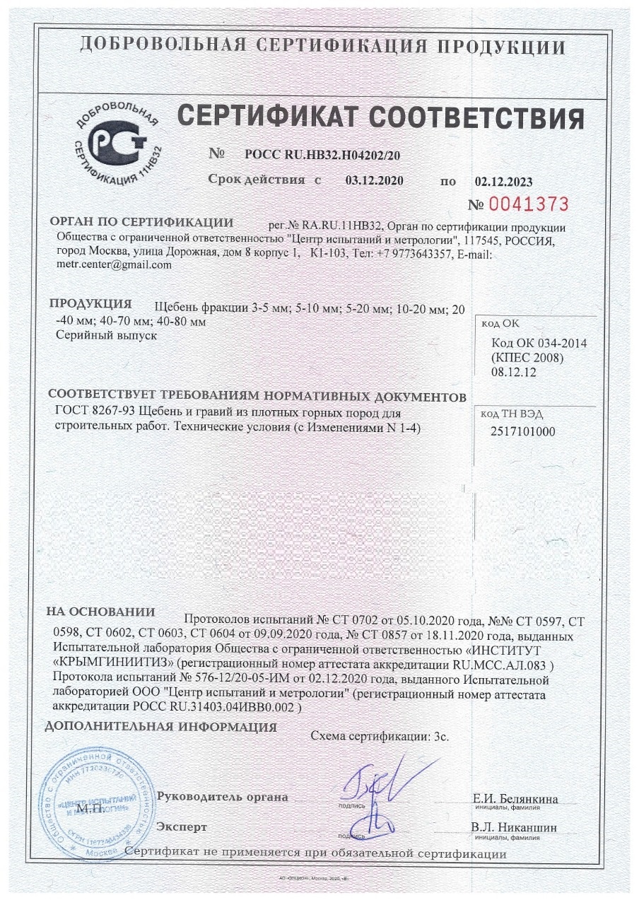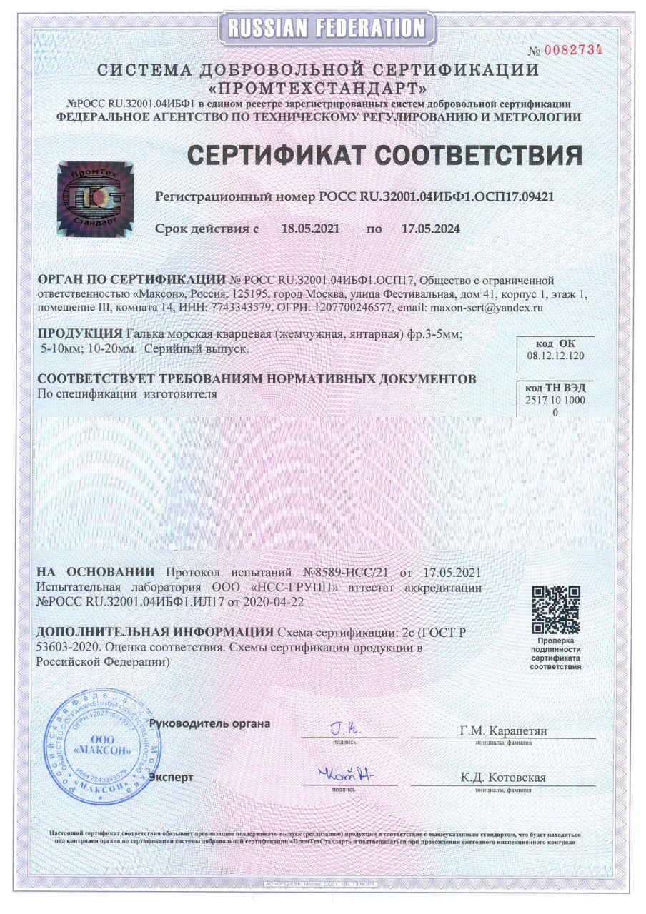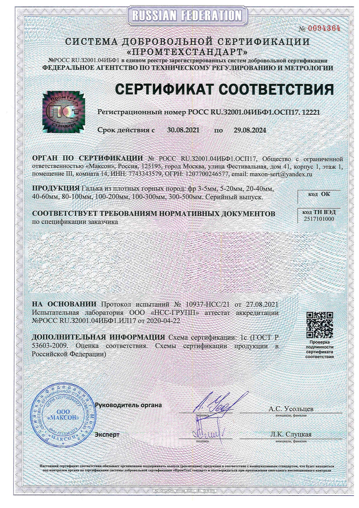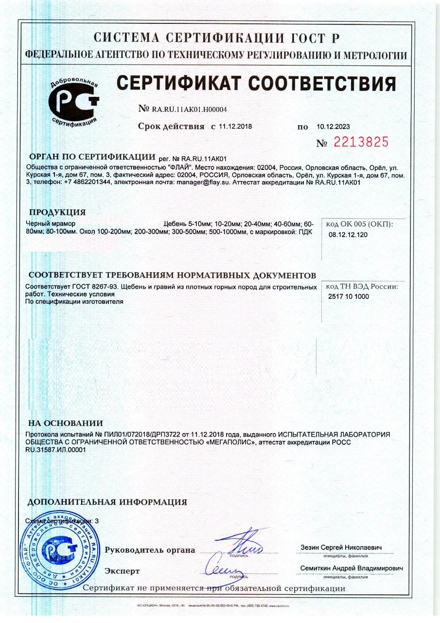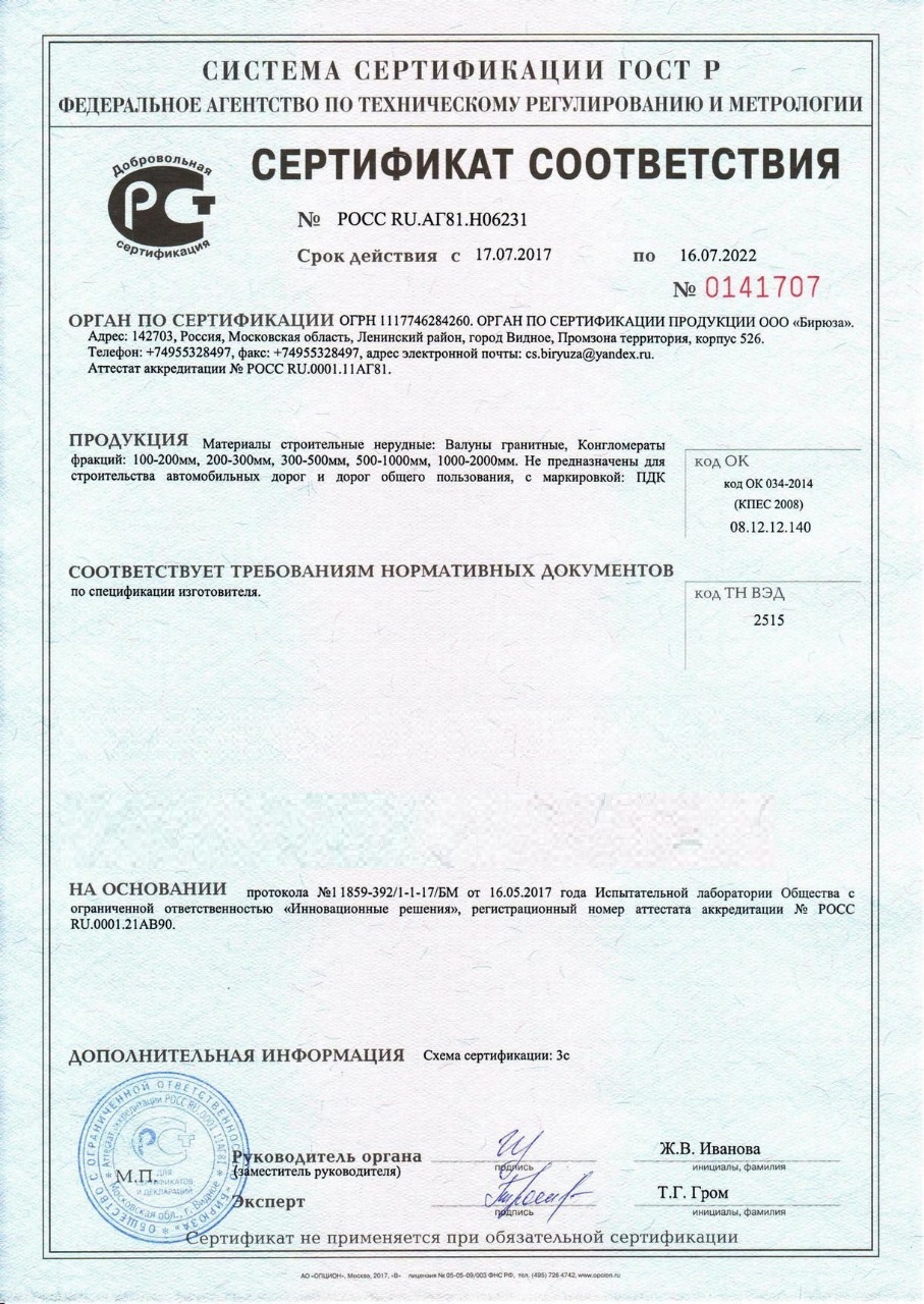 Сертификат соответствия – документ, подтверждающий соответствие продукции требованиям качества и безопасности, установленными для нее действующими стандартами и правилами. Наш камень, который Вы сможете заказать с доставкой в Иваново , обладает всеми необходимыми документами для реализации и при необходимости могут быть предоставлены все необходимые подтверждающие документы при поставке.